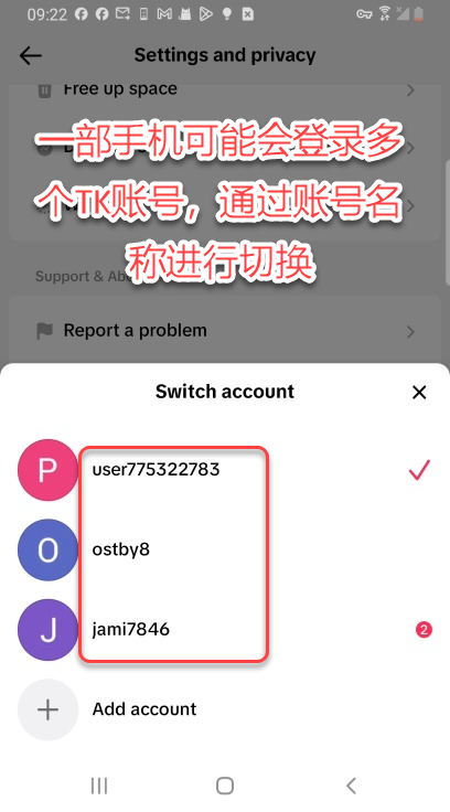 为什么要严格限制账号名称保持一致?因为花漾 TK 支持在一部手机中可以登录多个 TikTok 视频账号,这就意味着需要通过账号名称判断当前登录的是哪个账号,如下图所示:
