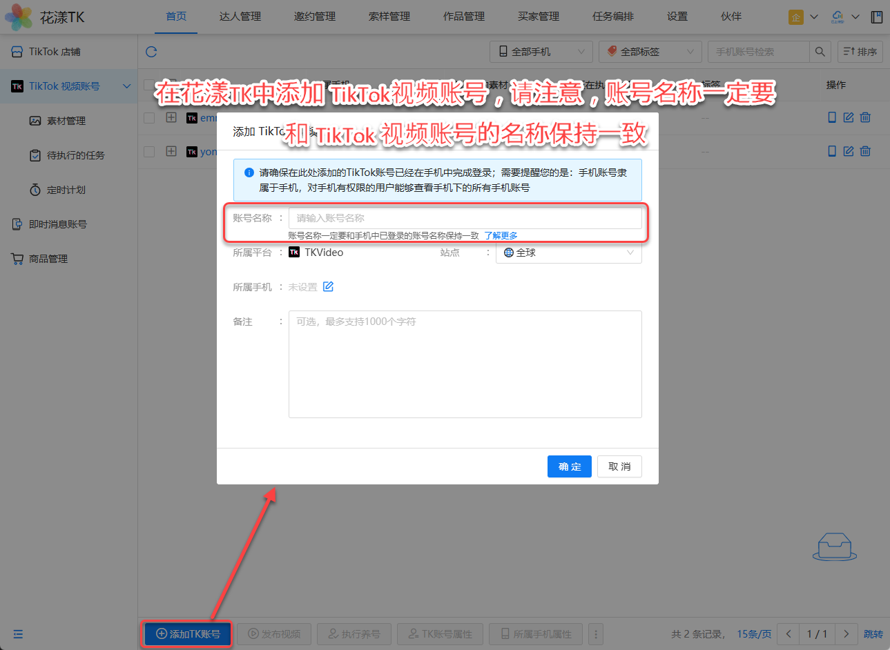 首先,请在花漾 TK 中添加 TikTok 视频账号: