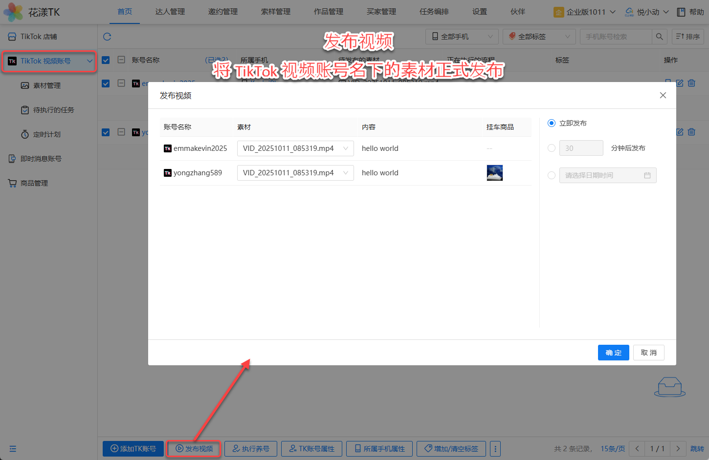 当素材准备完毕后,就可以选中 TikTok 视频账号,进行视频发布了,如下图所示: