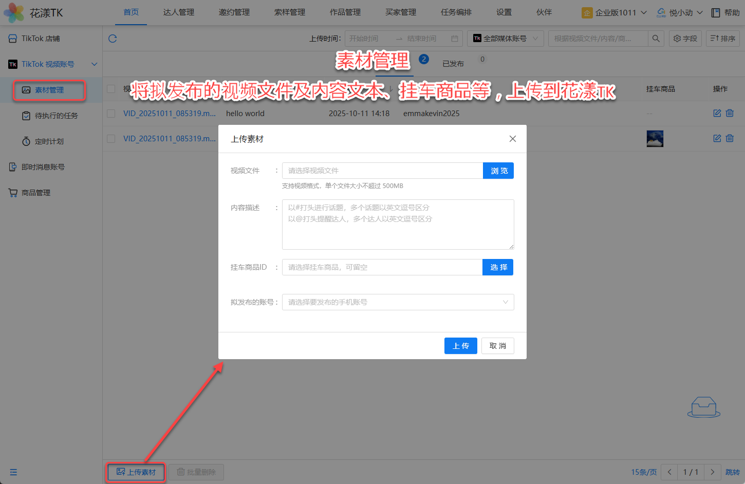 请在素材管理中,将拟上传的视频文件(称之为“素材”)上传到花漾TK: